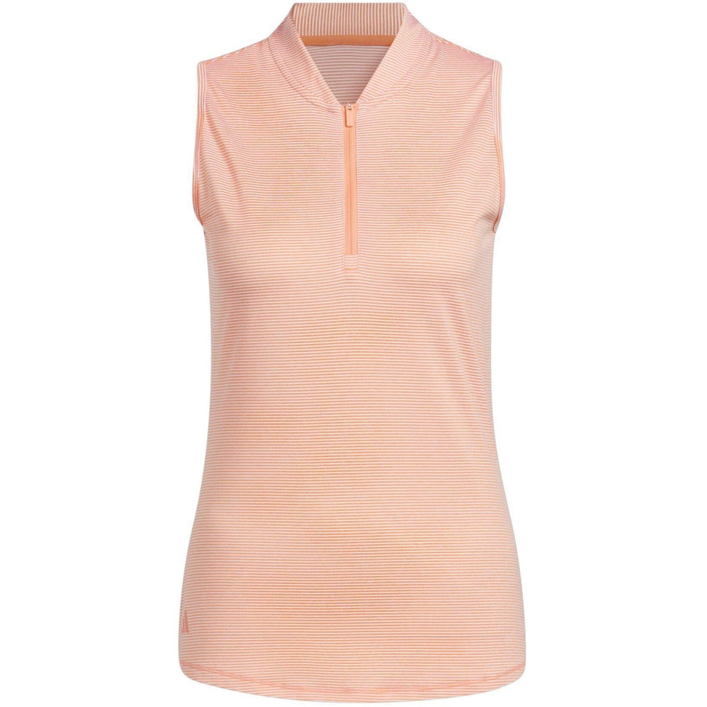 Adidas HT1247 dames mouwloze polo. Tweekleurige tanktop. Deze golfpolo is gemaakt van zacht, rekbaar materiaal om u comfortabel te houden van de tee tot de laatste putt. Door het mouwloze ontwerp kunt u vrij bewegen en de halve ritssluiting helpt u te ademen bij warmer weer.