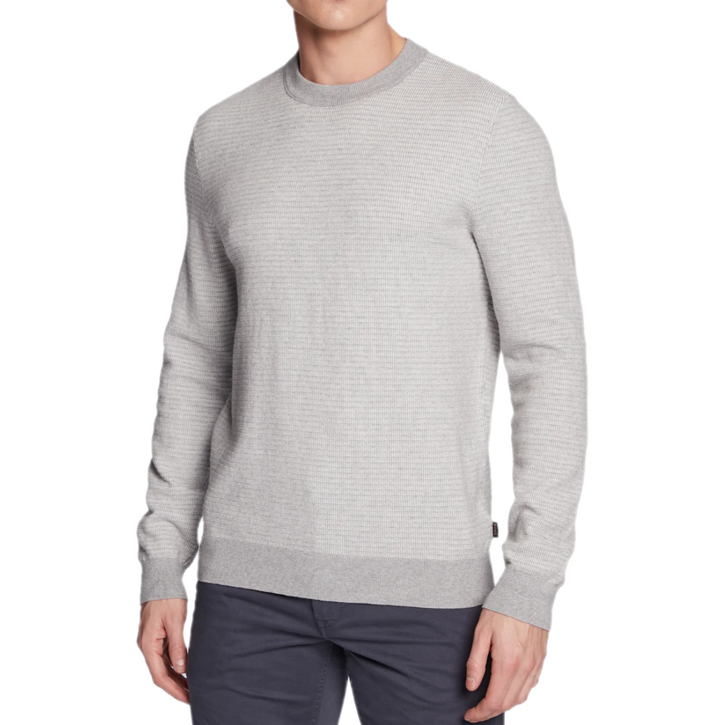 BOSS Avobano 50474865-072 heren trui. Een pullover in volledig getextureerd tweekleurig gebreid ontwerp met een geribbelde ronde hals en geribbelde manchetten aan de lange mouwen en een elastische geribbelde tailleband. Het kenmerkende BOSS pinch tag-logo is in de linker zijnaad geweven in zwart en oranje.