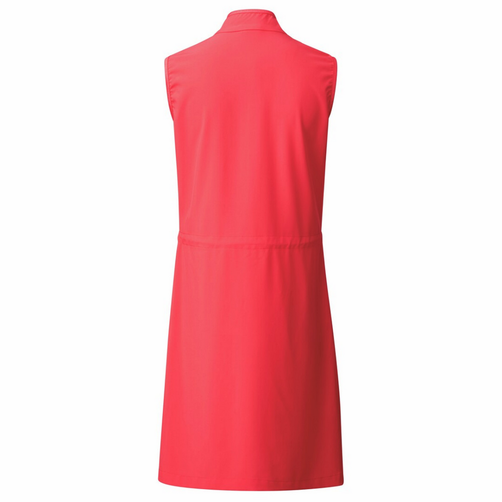 Daily Sports Kaiya 443/315 452 golfjurkje. Een mouwloze golfjurk met strakke lijnen en goed gekozen details zoals de linten rond de armsgaten en de korte opstaande kraag. De pasvorm is nauwsluitend met een trekkoord in de taille. De jurk is gemaakt van een gerecycled materiaal dat zowel flexibel als snel drogend is.