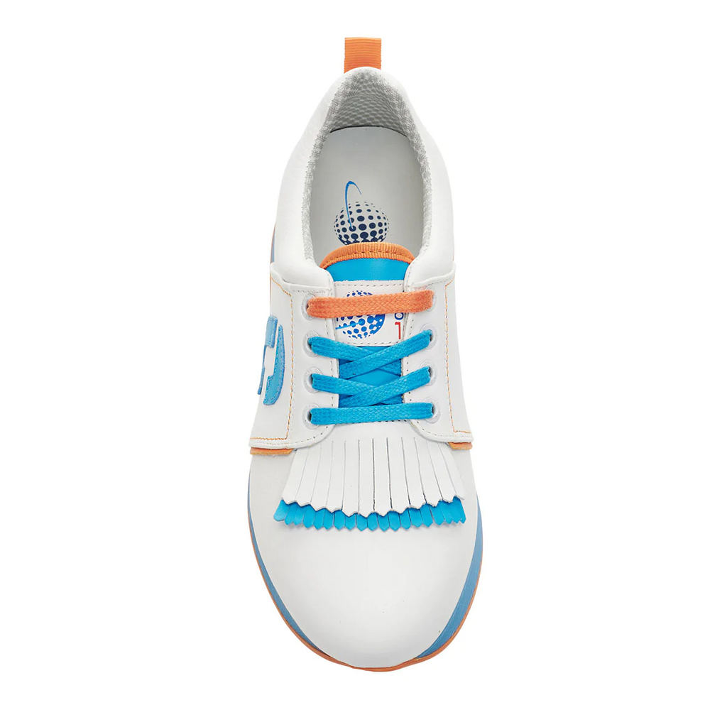 Duca del Cosma 11929-00 Westcliff dames golfschoen met een speciale make-over speciaal ontworpen voor het KLM Open. Gemaakt van zacht leer met textieldetails, u blijft droog en comfortabel, dankzij het ademende membraan en de ARNEFLEX® binnenzool van traagschuim. De Airplay VI-buitenzool is zowel functioneel als modieus en biedt flexibiliteit en demping, optimale grip van de 5 mm noppen over de buitenzool en een teenbumper om slijtage te voorkomen en uw voeten te beschermen.