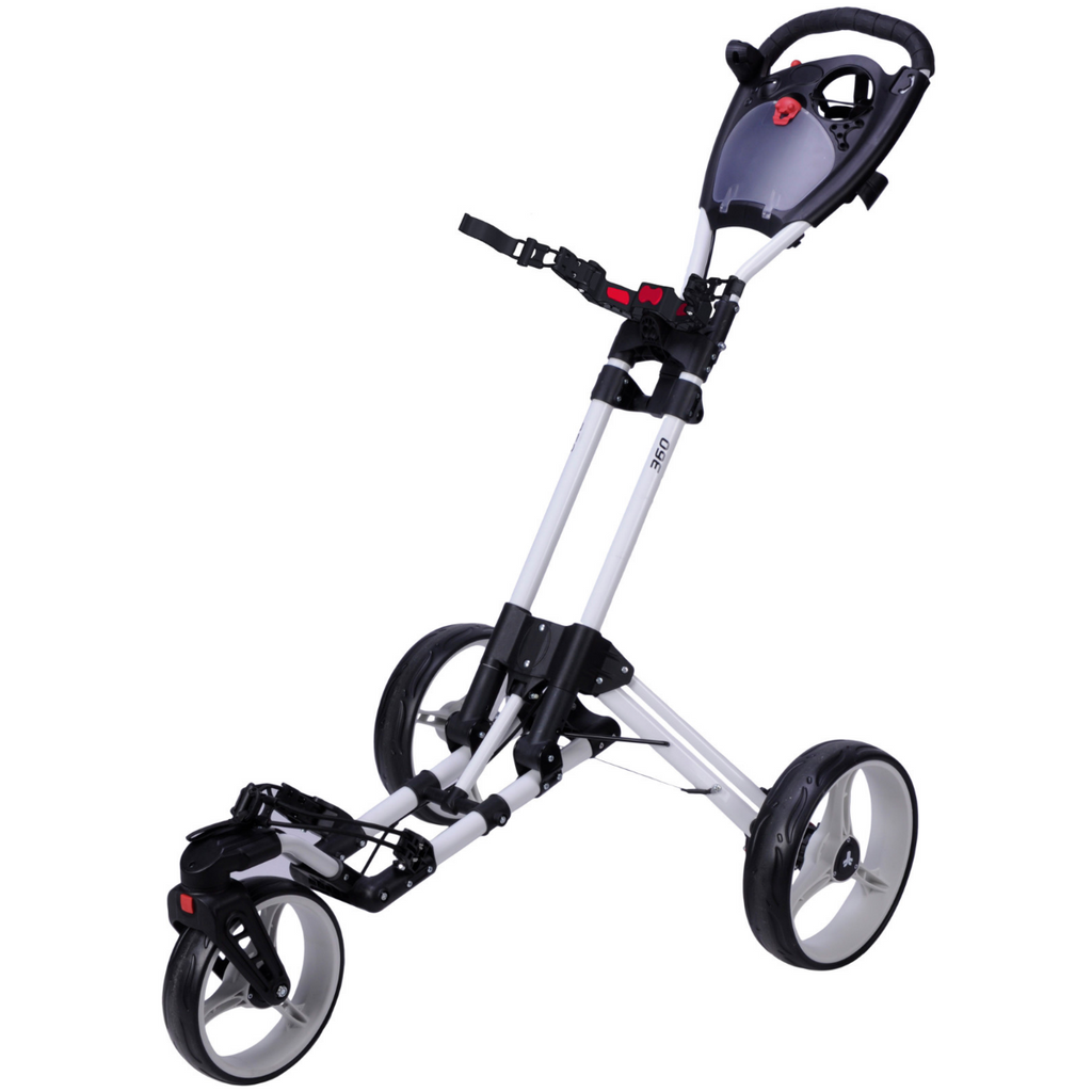 Fastfold FF4500002 golftrolley 360. Deze trolley heeft een 360 graden draaiende voorwieltechnologie, gecombineerd met vouwtechnologie met één knop. Creëert het meeste gemak om de trolley op een golfbaan te gebruiken.