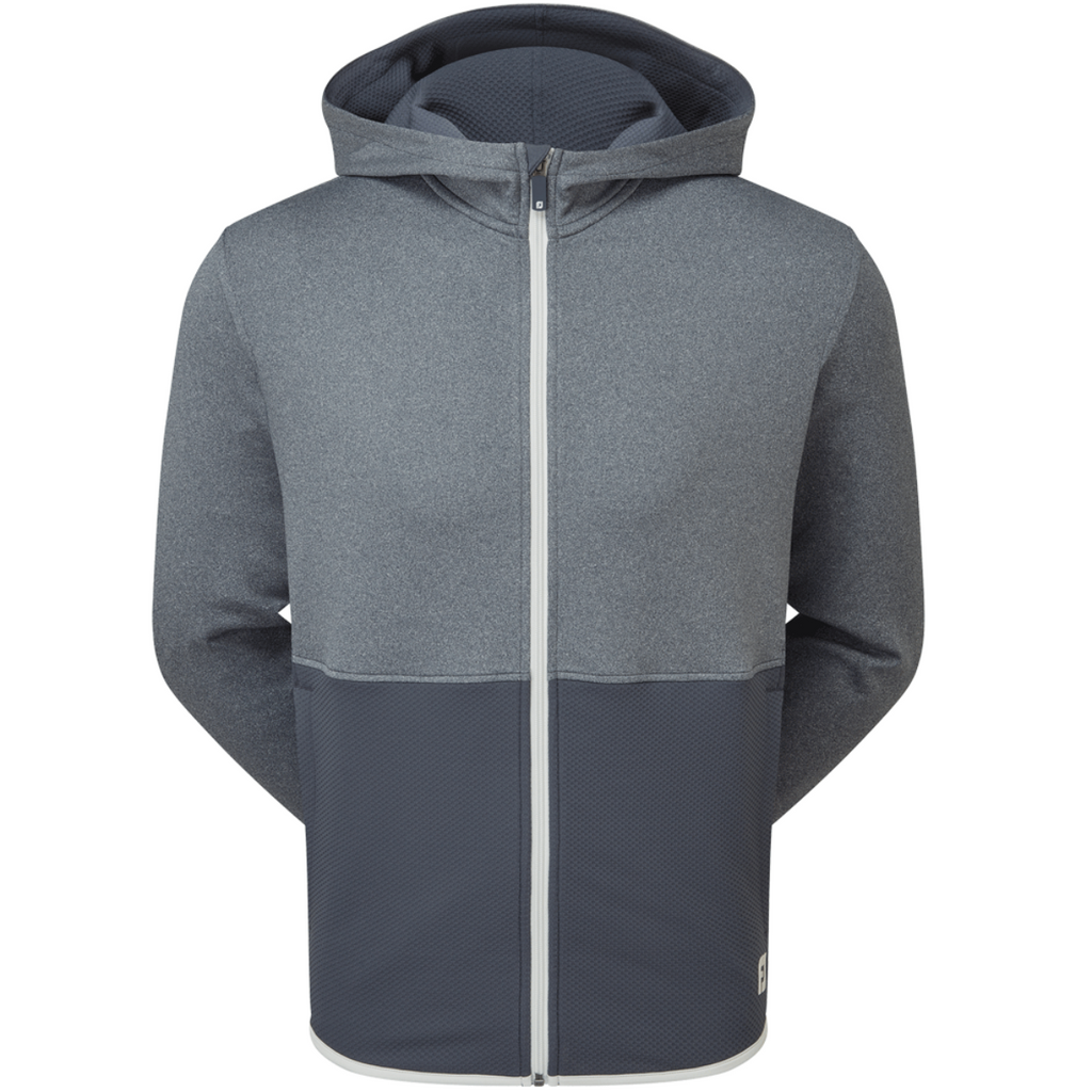 Footjoy ThermoSeries 89936 heren hoodie met volledige ritssluiting. Deze hoodie is ontworpen om zich aan te passen als het weer verandert. Geborstelde Jersey Knit-stof zorgt voor een ongelooflijk zacht gevoel. Open handzakken voor extra warmte en opslag. Elastische zoom- en manchetbinding voor verbeterde pasvorm en extra comfort.