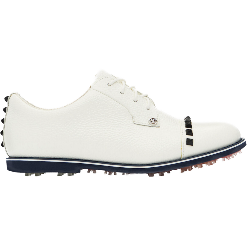 G/Fore Welt Stud Gallivanter G4LC20EF05 Spikeless dames golfschoen. De Gallivanter golfschoen is even stijlvol als comfortabel en combineert een atletische pasvorm met hoogwaardig waterdicht leer. Dit model is voorzien van metallic zilveren en gouden studs op de rand en het bovenwerk. De Welt Stud Gallivanter beschikt over een ultralichte zool in combinatie met een uniek noppenontwerp voor optimale grip op de baan. Deze golfschoen heeft een wasbaar en antibacterieel voetbed van drievoudig dicht schuim voor superieur comfort, samen met comforttechnologie die luchtcirculatie naar de voeten mogelijk maakt en de voeten een ultieme massage geeft.