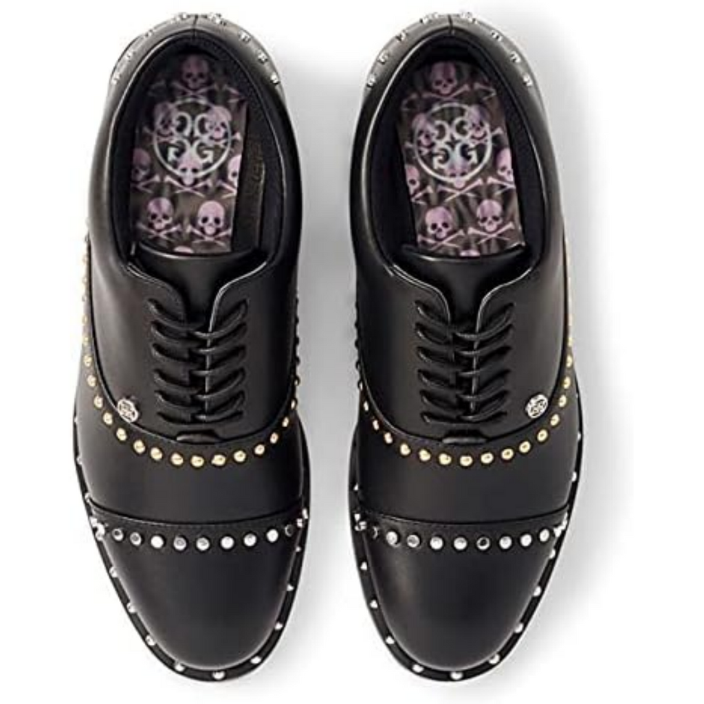 G/Fore Welt Stud Gallivanter G4LS21EF10 Spikeless dames golfschoen. De Gallivanter golfschoen is even stijlvol als comfortabel en combineert een atletische pasvorm met hoogwaardig waterdicht leer. Dit model is voorzien van metallic zilveren en gouden studs op de rand en het bovenwerk. De Welt Stud Gallivanter beschikt over een ultralichte zool in combinatie met een uniek noppenontwerp voor optimale grip op de baan. Deze golfschoen heeft een wasbaar en antibacterieel voetbed van drievoudig dicht schuim voor superieur comfort, samen met comforttechnologie die luchtcirculatie naar de voeten mogelijk maakt en de voeten een ultieme massage geeft.