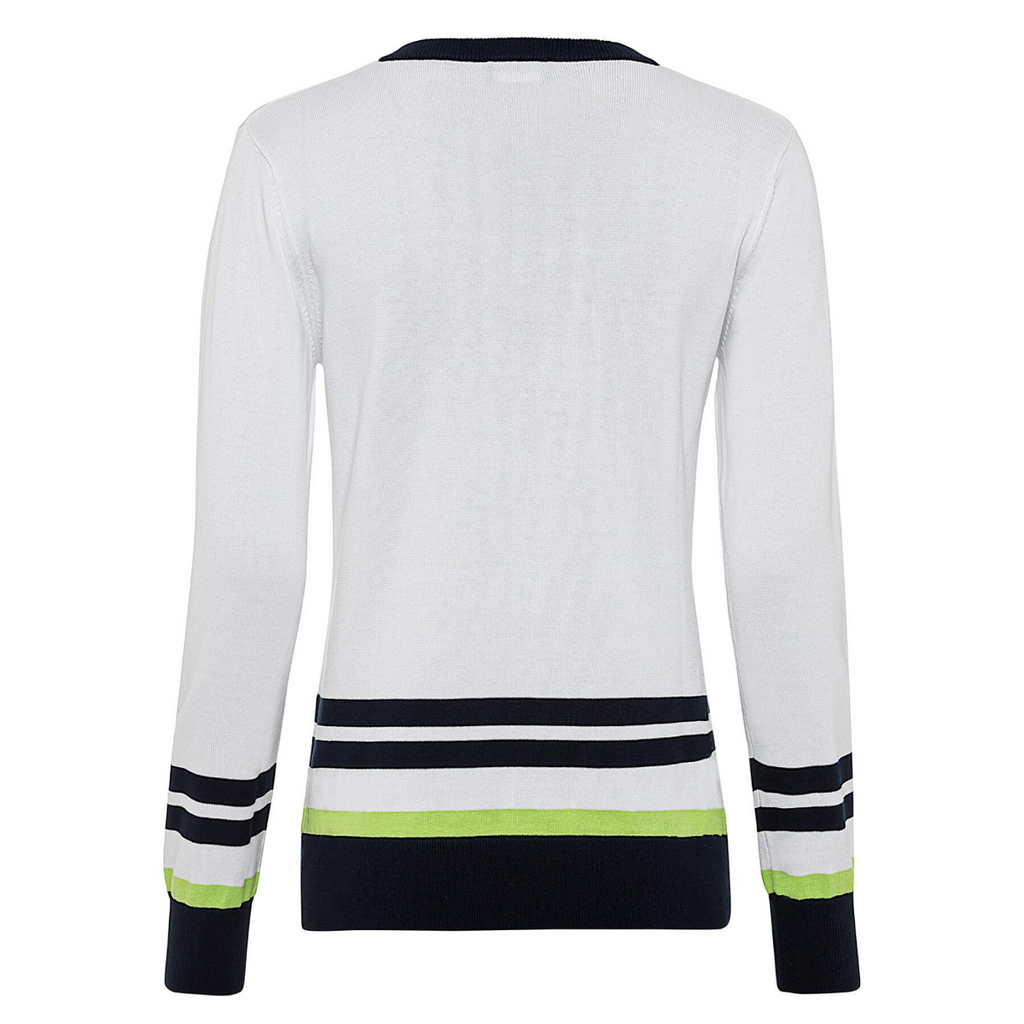 Golfino Drive 4411921 100 dames golftrui. Door de combinatie van aangenaam zacht Pima-katoen en een sportief design is deze golftrui een echte blikvanger. De originele brede banden in contrasterende kleur bij de taille en mouwen zorgen voor gerichte accenten. De modieuze V-hals wordt bovendien geaccentueerd door kleuren die deze mooi accentueren. De fijne natuurlijke vezels en de relaxte regular fit garanderen een hoog draagcomfort, zelfs tijdens sportieve activiteiten. De look wordt gecompleteerd door een geborduurd logo op borsthoogte.