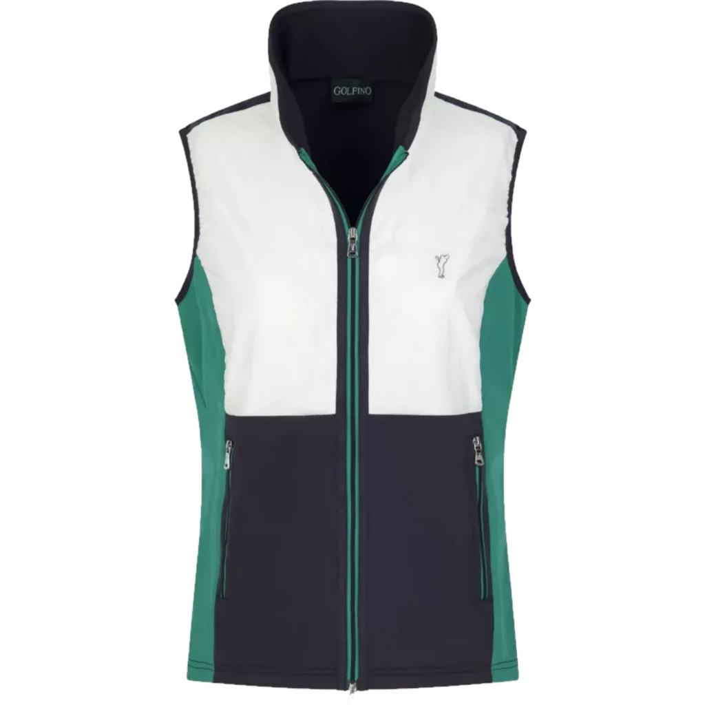 Golfino Extra Round 5452025 100 dames bodywarmer. De tweekleurige voorkant is gemaakt van microvezel, terwijl de zijpanelen en de effen achterkant van fleece zijn. De uitzonderlijk zachte binnenkant biedt superieur comfort en effectieve bescherming tegen de kou. U profiteert ook van de hoogwaardige techno-stretchstof, die zorgt voor uitstekende elasticiteit. Een contrasterende tweewegritssluiting en twee zijzakken met rits maken het doordachte ontwerp compleet.