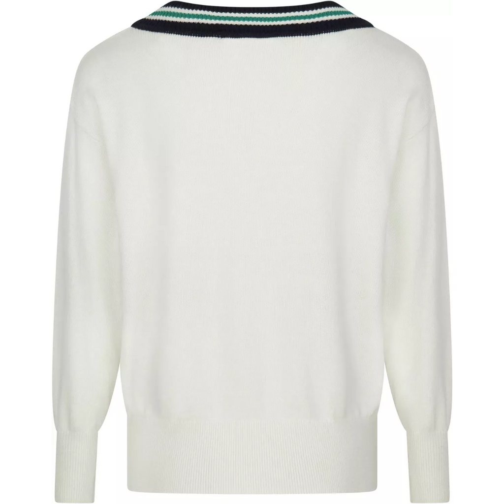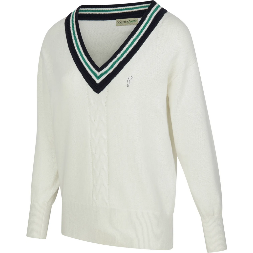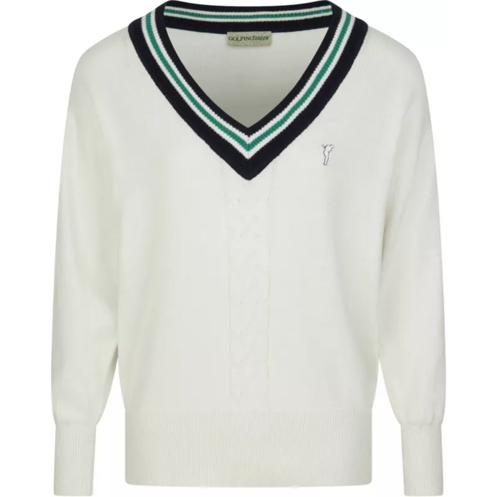 Golfino Extra Round V-Neck 5412125 100 dames golftrui. De wijde V-hals is voorzien van een aantrekkelijke, veelkleurige decoratieve streep die contrasteert met het effen ontwerp. De relaxte, losse pasvorm en de verlaagde schouders geven de trui een casual uitstraling. Een centrale kabelgebreide streep op de voorkant harmonieert met de brede, gebreide manchetten en zoom, wat zorgt voor een comfortabele pasvorm. Hoogwaardig biologisch katoen gemengd met kasjmier biedt uitzonderlijk comfort en een zacht gevoel.
