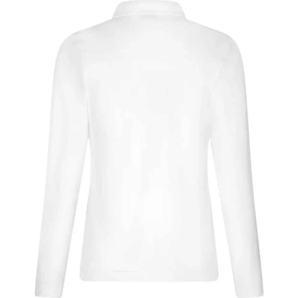 Golfino Flighted By Style 5431526 108 dames polo met lange mouw. De opvallende zigzagprint op de borst is een charmant detail. Het comfortabele, zachte materiaal voelt heerlijk aan op de huid. Geniet van optimale bewegingsvrijheid dankzij het hoge elastaanpercentage. De nauwsluitende slim fit geeft het shirt een zeer vrouwelijk silhouet, dat nog eens extra benadrukt wordt door het glinsterende logo-borduurwerk aan de zoom. De contrasterende korte rits met zilverkleurige ritstrekker zorgt voor een perfecte pasvorm.