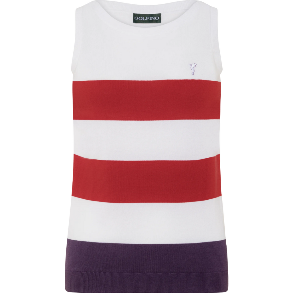 Golfino Moving Forward 4411523 100 dames slipover. Een veelzijdige, mouwloze top met boothals is perfect voor zowel de golfbaan als een wandeling door de stad. Deze top is gemaakt van zuiver, hoogwaardig Pima-katoen en biedt niet alleen uitstekend draagcomfort, maar ook een aantal functionele voordelen. Katoen is ademend, vochtregulerend, onderhoudsvriendelijk en duurzaam. De elegante boothals en de brede driekleurige blokstrepen geven de trui een klassiek-elegante uitstraling en maken hem de ideale partner voor veel basics in uw golfgarderobe.