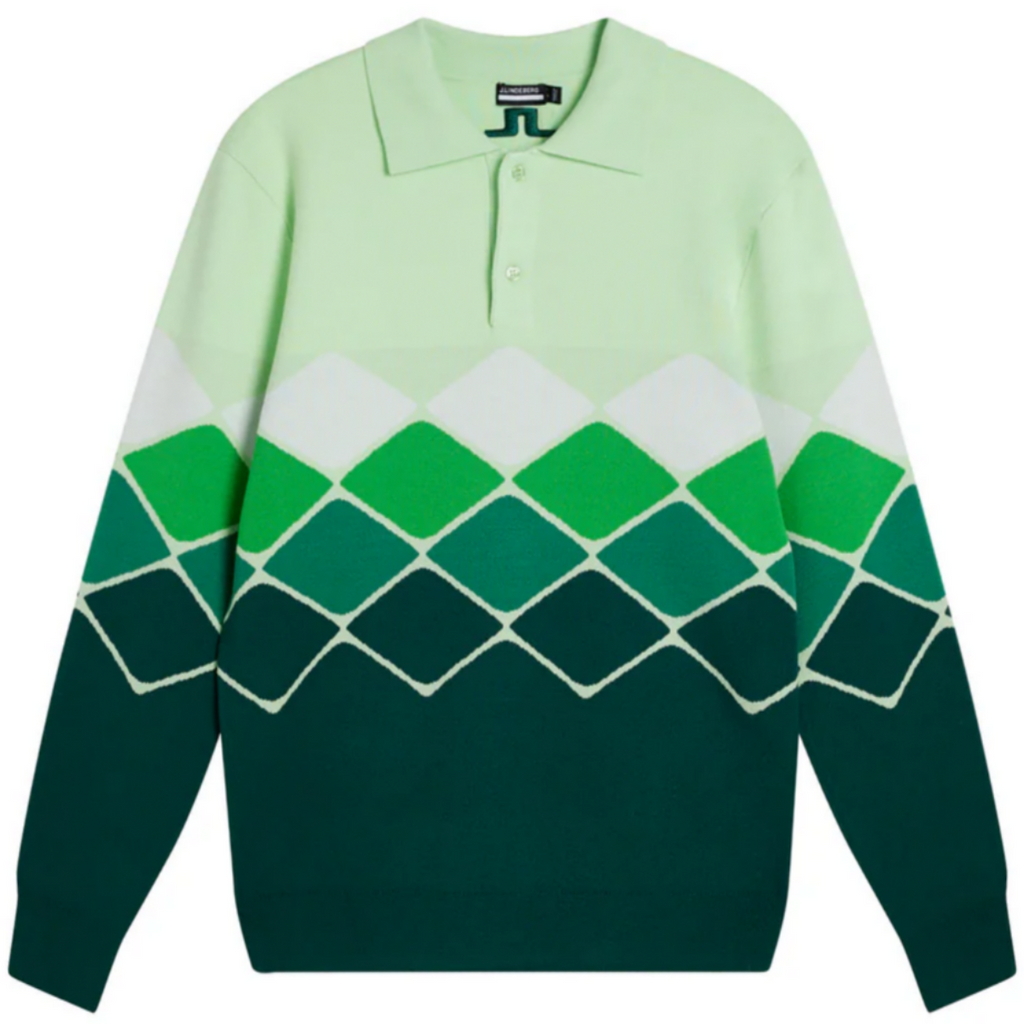 J. Lindeberg Ron AMKW08158 M374 heren golfshirt. Een gebreide golftrui gemaakt van een zachte en elastische mix van viscose en polyester. De veelkleurige diamantvormige stof is een knipoog naar de iconische Argyle stijl, met een kleurverloop langs de body en de mouwen voor een ombre-effect. De geribde randen zijn tijdloos, terwijl de lijst met knopen dit klassieke item een moderne uitstraling geeft.