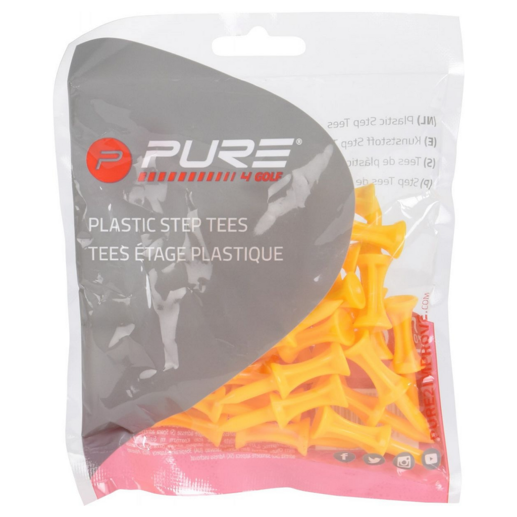 Pure2improve Plastic tees 30 stuks van 1.69 inch = 43 mm. Deze tees zijn voorzien van een getrapt kasteel ontwerp om een continuiteit in u tee hoogte te geven zodat dit constanter is in uw spel.