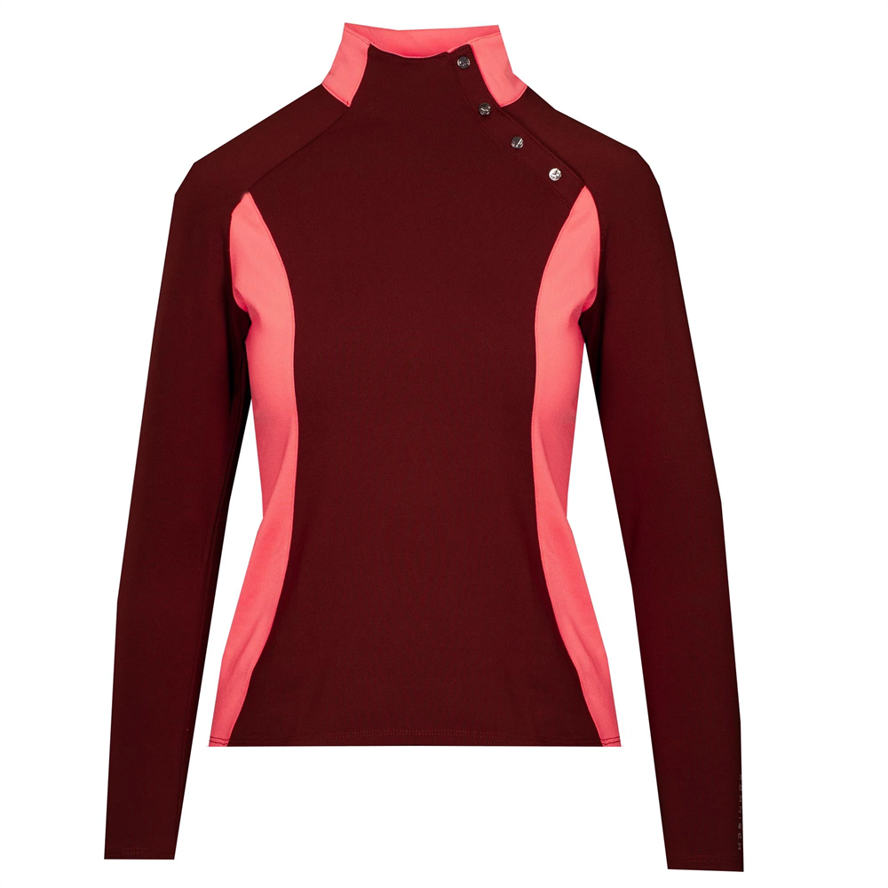 Rohnisch Megan 110743 dames baselayer. Een ultiem laagjesstuk, gemaakt van thermofleece met hoge kraag. Mooie zijpanelen en kraagdetails die een vleugje print of contrasterende kleur geven. Vochtbestendig materiaal met geborstelde binnenkant voor extra warmte. Drukknoopsluiting bij de halsopening.