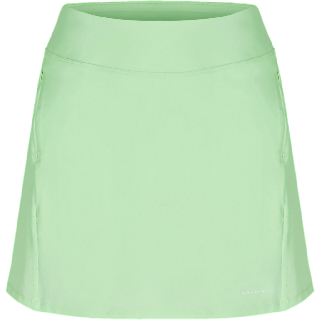 Röhnisch Rumie 111767 S406 golfrokje. Gemaakt van 89% gerecycled polyester met sneldrogende en vochtafvoerende eigenschappen. Panelen met lasergesneden gaten voor extra ventilatie, met een binnenzak en ritsen in de zakken. Voorzien van een binnenbroekje in dezelfde kleur. Normale pasvorm.